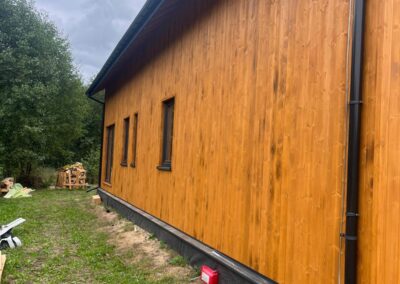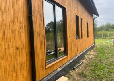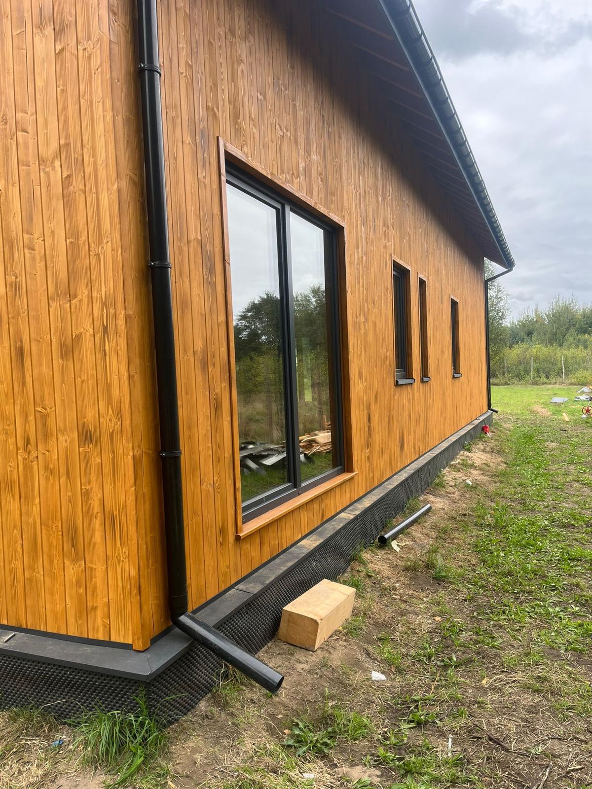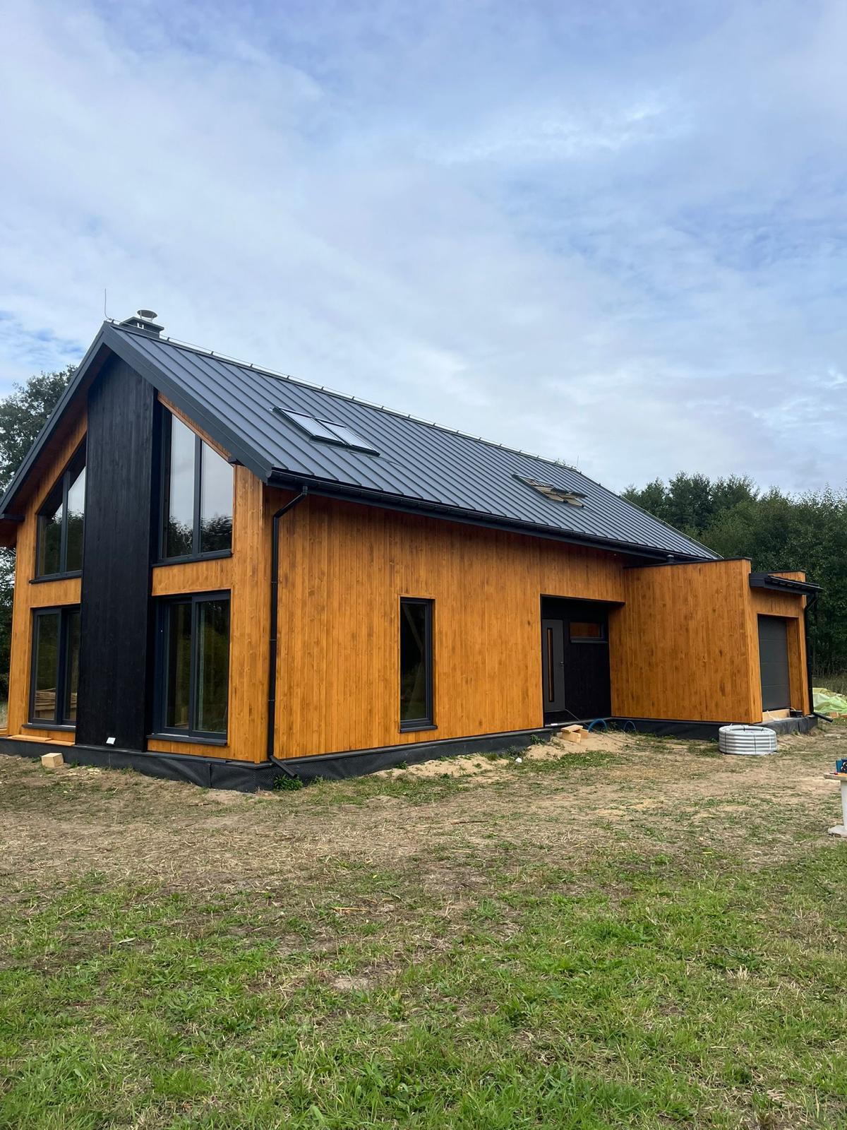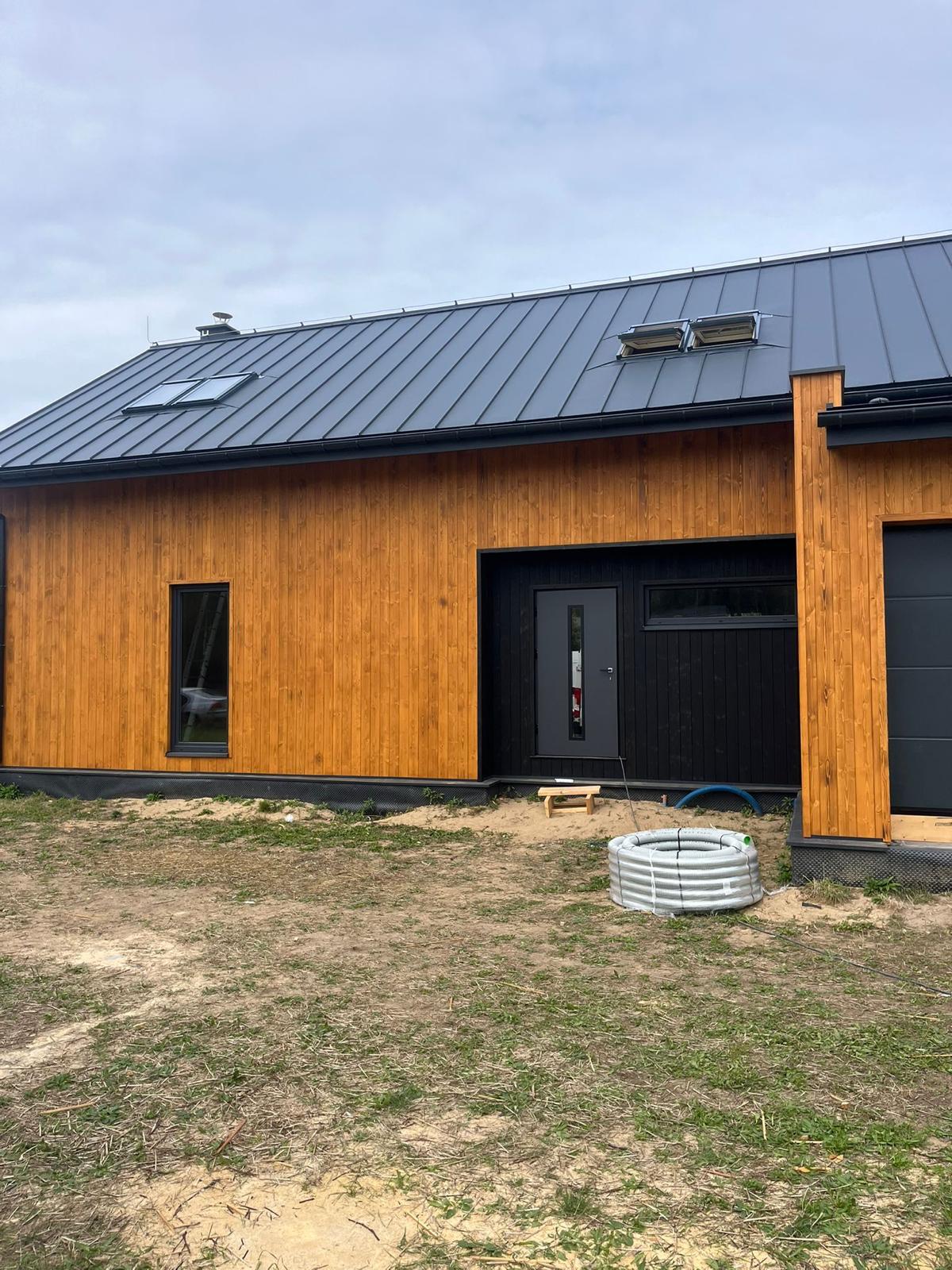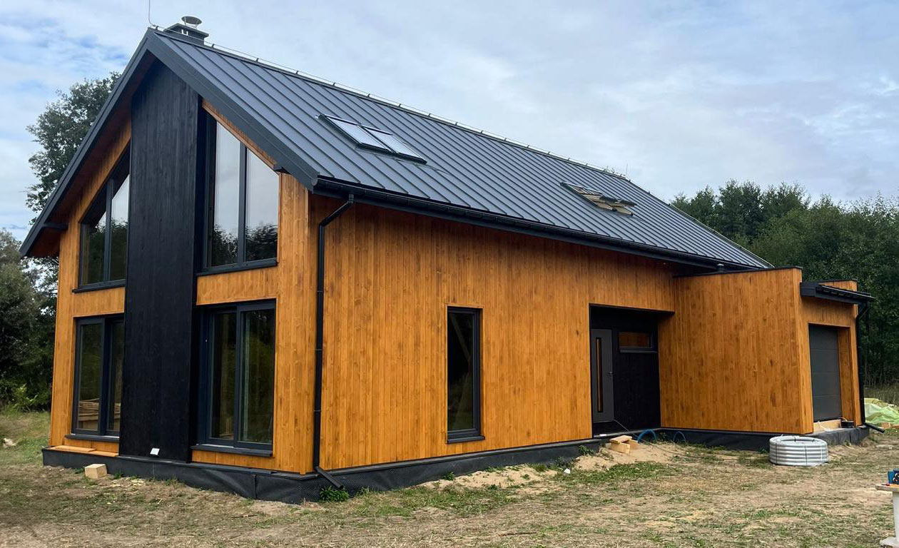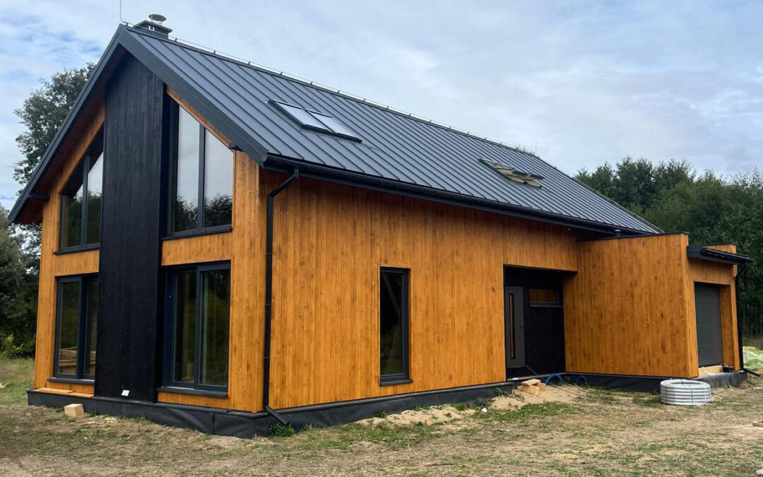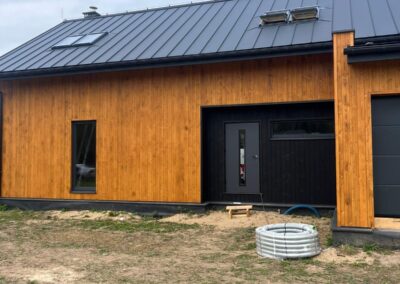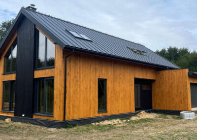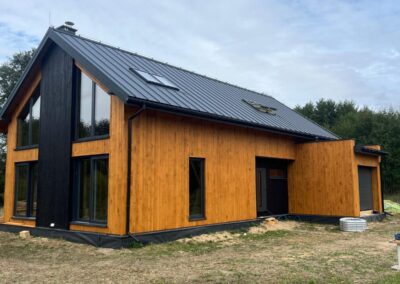 Budynek o łącznej powierzchni 159,39 m². Elewacja wykonana z deski elewacyjnej opalanej wraz z przeszklonym i otwartym salonem.